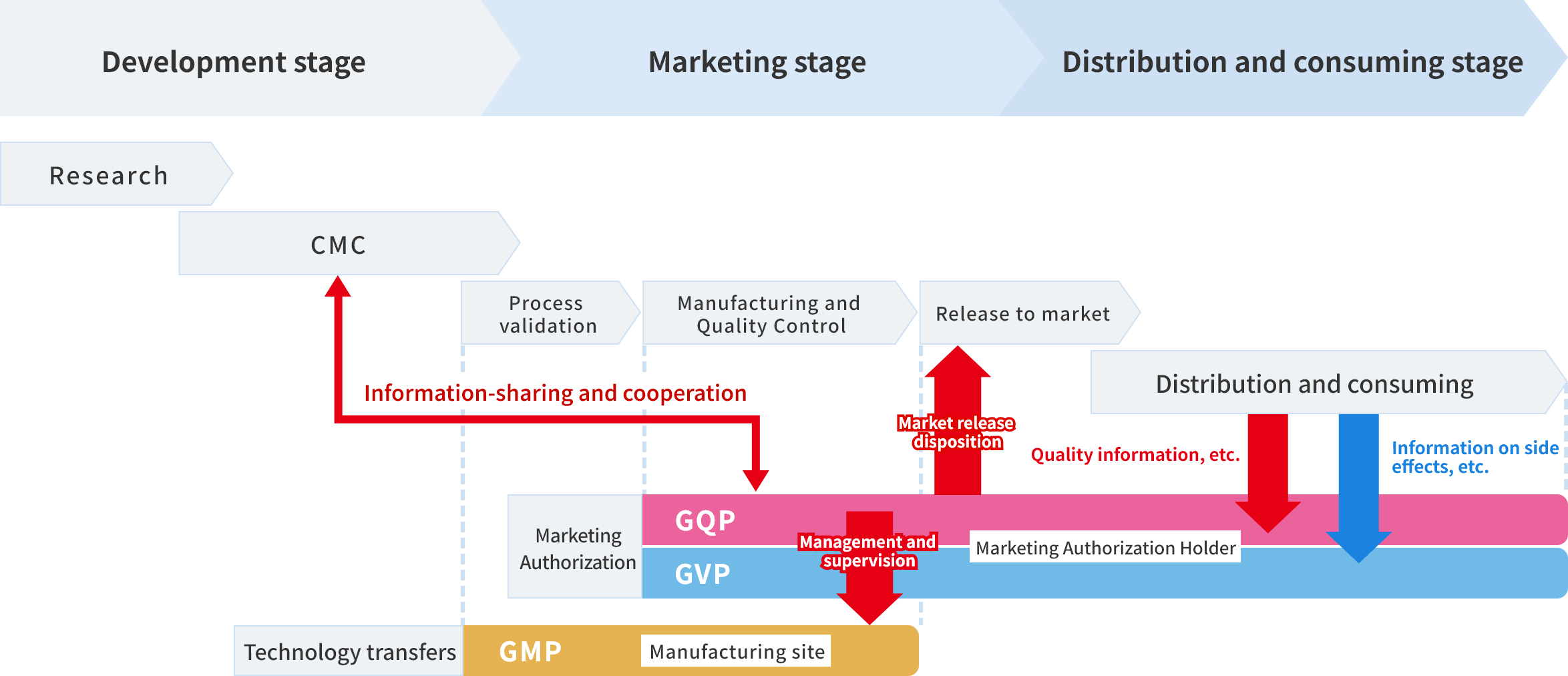 When realizing these initiatives, we carry out our daily work in compliance with laws and regulations such as the Act on Pharmaceuticals and Medical Devices (PMD Act), GQP Ministerial Ordinance,*2 and GMP Ministerial Ordinance.*3