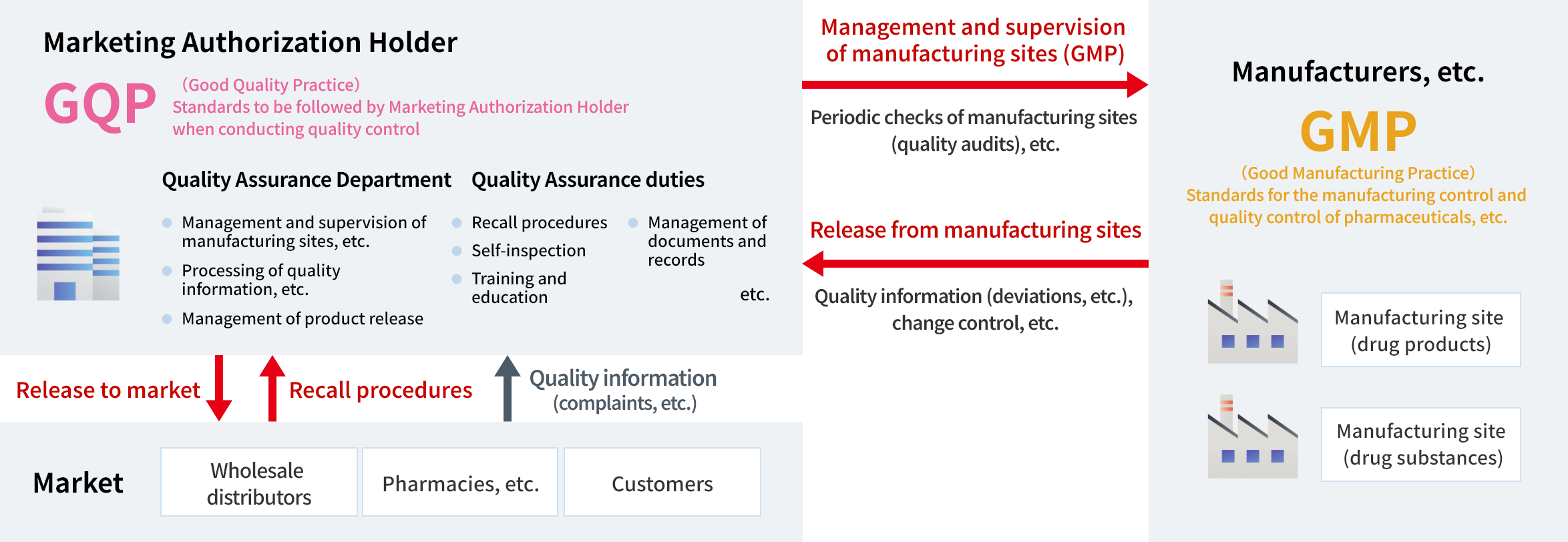 - *2 GQP (Good Quality Practice) Ministerial Ordinance: Standards that stipulate methods of quality management for drugs, quasi-drugs, cosmetics and regenerative medicine products, etc. (Ordinance of the Ministry of Health, Labour and Welfare)