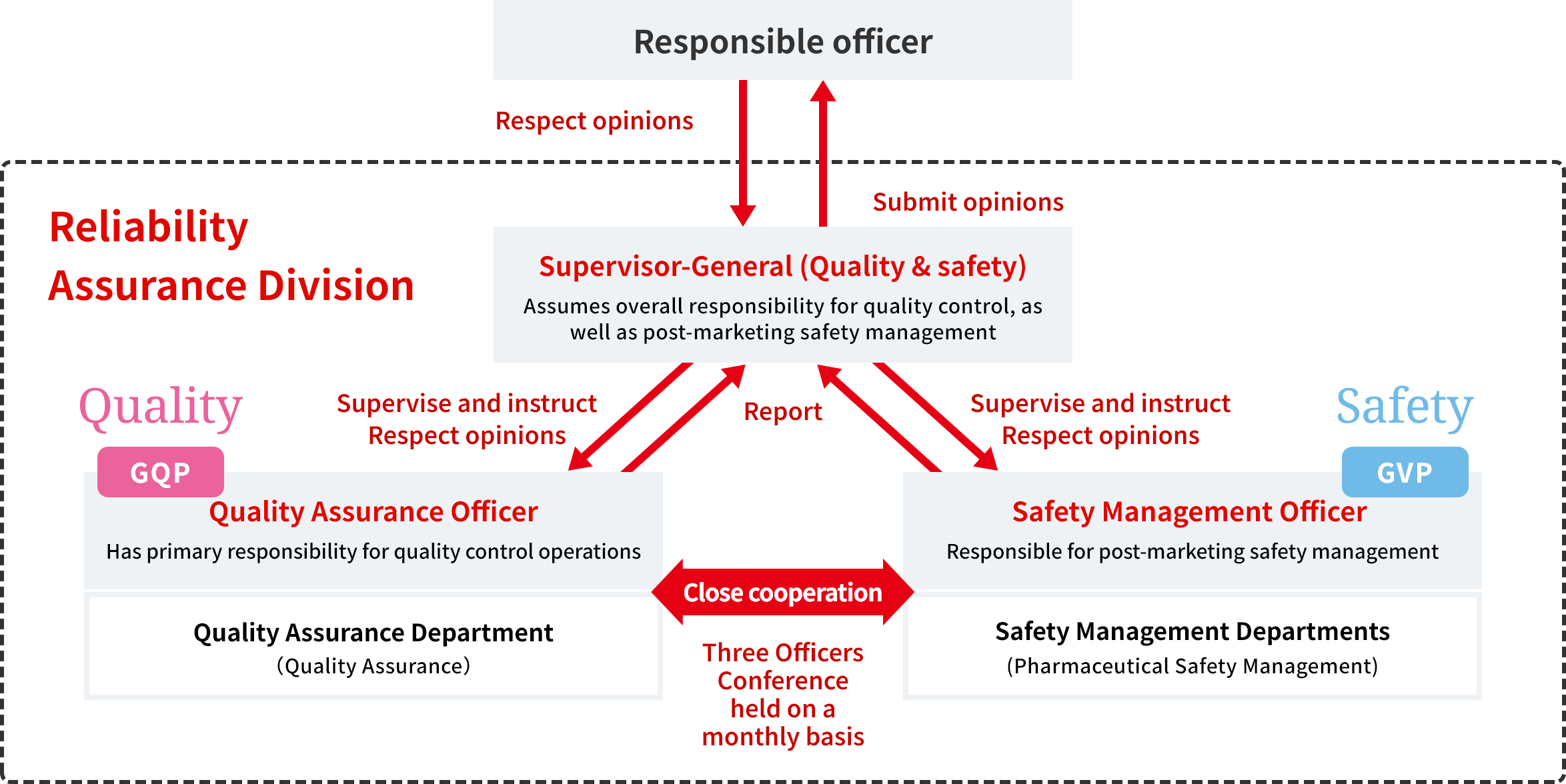 Our quality assurance system consists of a Three Officers Conference held once a month, where the three key parties in Marketing Authorization Holder review and discuss issues. The content of the reviews and discussions at these Conferences are reported to our President, who is the responsible officer, so that issues can be shared. In this way, we are making efforts to improve product quality involving our President.